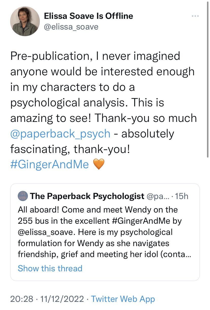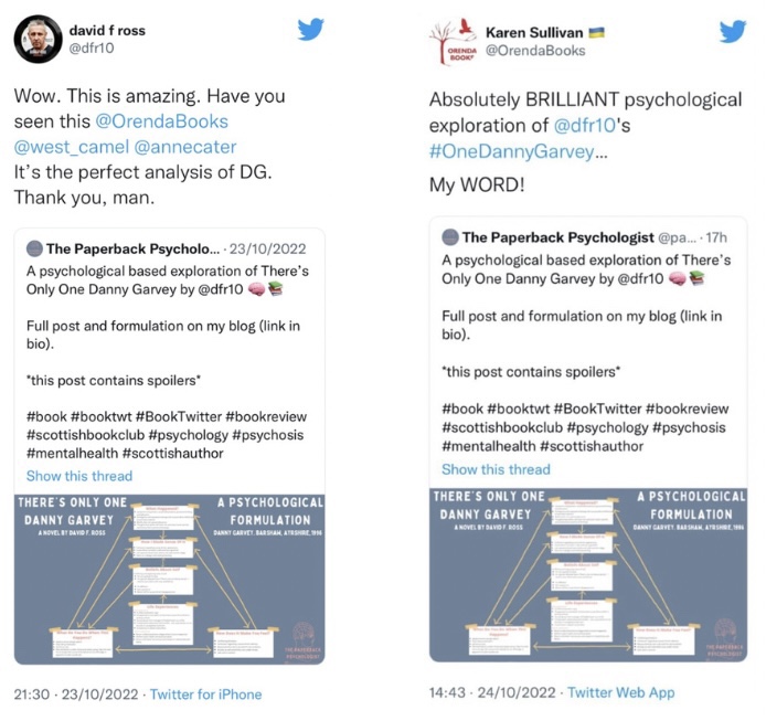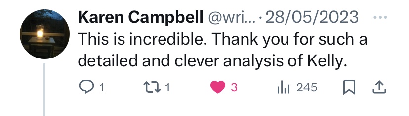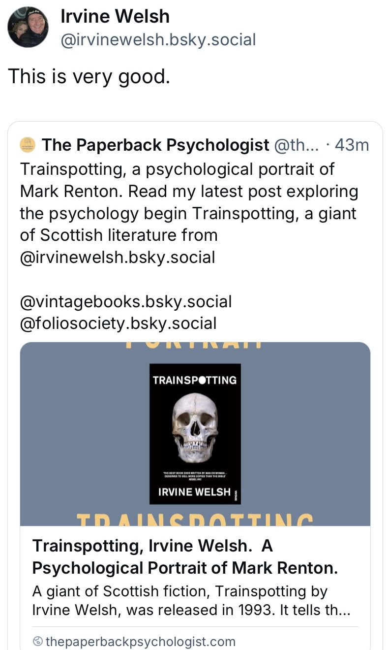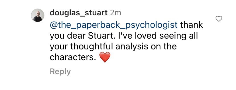 When I started this blog, I hoped that a handful of people might find it interesting. I’ve been so surprised by the response and particularly so when an author has got in touch about my interpretation of their character. This has been a real highlight for me and keeps me inspired to keep working on more projects. Thank you again for reading my psychological explorations of your characters and for sharing these. I have included a selection here including some kind words from Irvine Welsh, Douglas Stuart, Graeme Armstrong, Garrett Carr, David F. Ross, Elissa Soave and Karen Campbell.