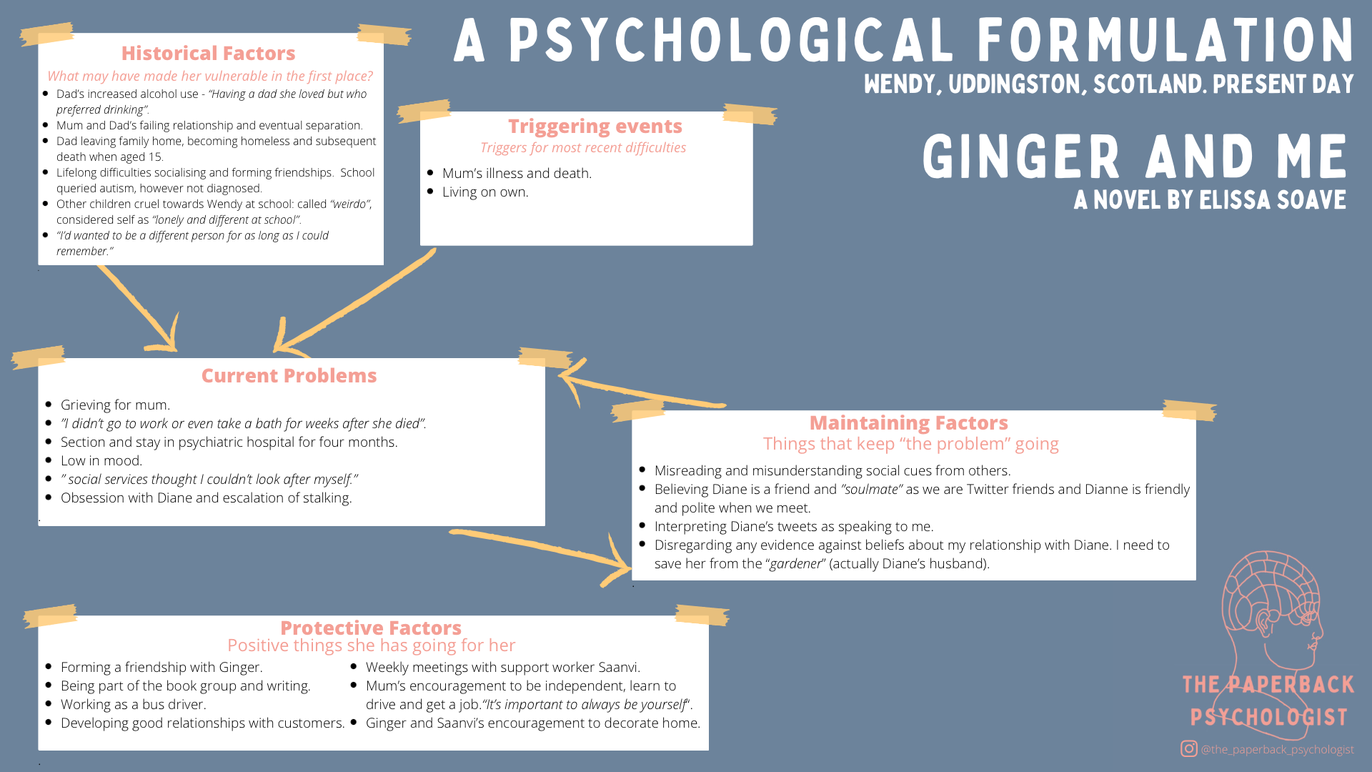 Wendy is a fascinating character, who is both incredibly robust and strong but at the same time very vulnerable. As readers we have the privilege of meeting her as she rebuilds herself in the aftermath of loss, forging new connections both successfully and unsuccessfully, through the streets of Uddingston on the 255 bus. The case formulation below is an attempt to explore the events that shape Wendy throughout Ginger and Me.