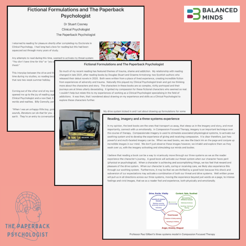I’m very proud to have been able to contribute to the Compassion Focused Therapy blog for Balanced Minds. It was a chance to step back and reflect on my relationship with reading and consider the insights that can be gathered from applying a psychological lens to literature, in particular Compassion Focused Therapy (CFT). In this I discuss the impact the writing of Graeme Armstrong and Douglas Stuart had on me and their important role in the inception of The Paperback Psychologist. I then use my psychological formulation of Andrew O’Hagan’s Mayflies to look at the application of CFT to literature.