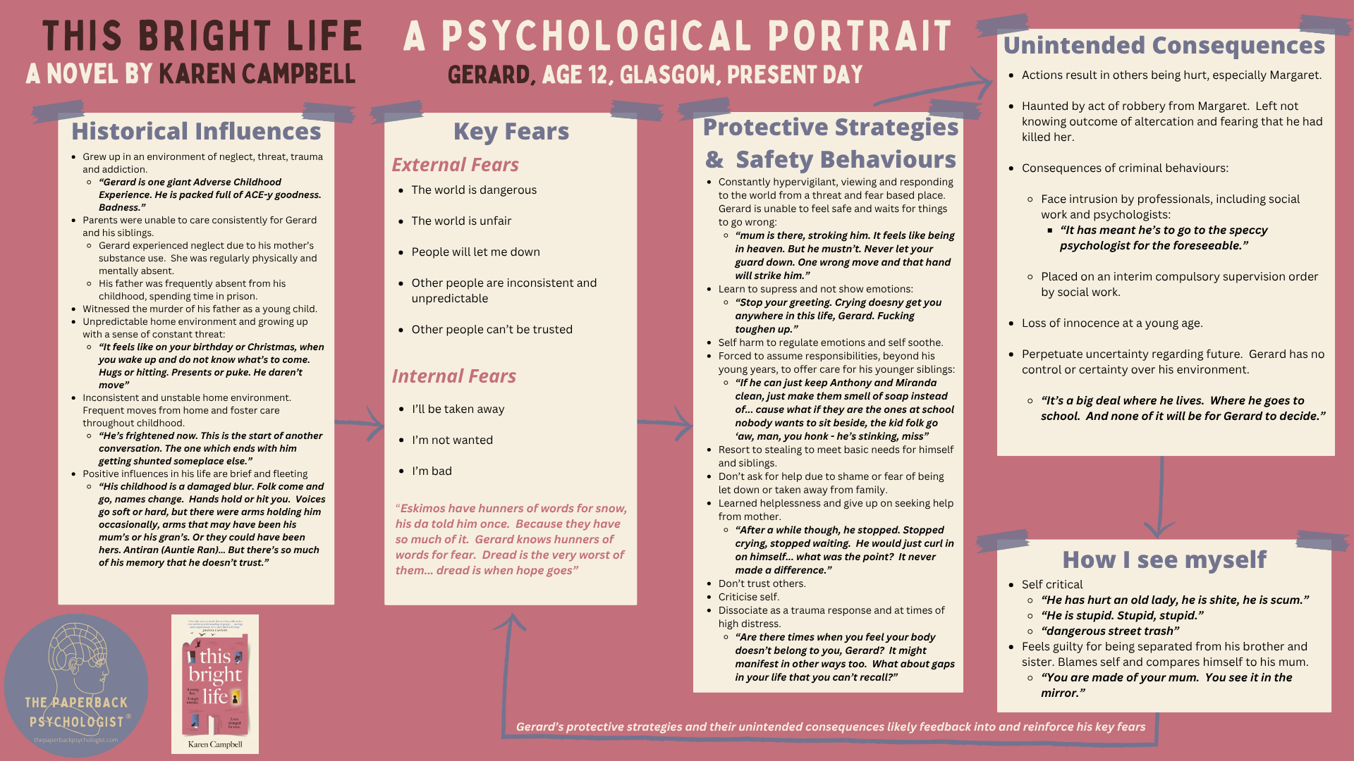 Each of the three main characters could be explored with a psychological portrait, however for the purpose of this blog post, I will focus on Gerard. I felt most drawn to his story and the many facets of his character created a deep emotional connection. Gerard’s story unfolds throughout the course of the novel, with the shocking truth of his early traumatic experiences revealed. This traumatic event, as well as sending him into the care system for the first time, had a profound psychological impact on him. Gerard experienced care from others as inconsistent, with his mother struggling with her substance use, meaning that she was regularly physically and mentally absent from Gerard and his two siblings. Gerard at just 12 years old, had to assume the parental role to his younger brother and baby sister. It is these very circumstances that lead to his fateful meeting with Margaret, as he struggles to find a way to feed and care for his siblings. Gerard’s other experience of care from people is from professionals and foster carers. Whilst this is more consistent, Gerard can experience this as transactional, controlling, conditional and changeable. Gerard is likely therefore to find forming relationships with others difficult and it hard to trust others. Furthermore, this appears to impact on how he sees himself, viewing himself as “bad” and “scum”. Gerard is dealing with ongoing trauma symptoms, including flashbacks and dissociation, because of witnessing the murder of his father when he was just 4 years old. In the psychological formulation below, I consider the likely coping strategies and protective behaviours that Gerard uses to protect against past and current threat. We can see how these lead directly into the key events of the novel and effect the course of his life.