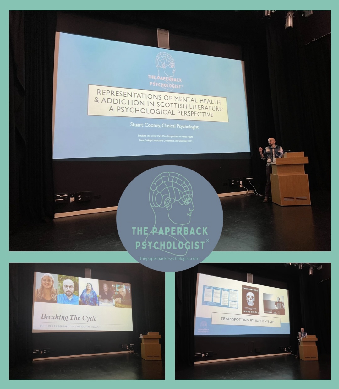 A guest speaker at New College Lanarkshire’s annual Breaking The Cycle conference. I joined author, musician and social commentator Darren McGarvey, PhD researcher Gavin Brewis, and student Julie Webster at the Coatbridge Campus. The event was host to informative, thought provoking and vital conversations on mental health, trauma, class and addiction. I spoke about my journey into Clinical Psychology and presented two psychological portraits from Irvine Welsh’s Trainspotting and Graeme Armstrong’s The Young Team.